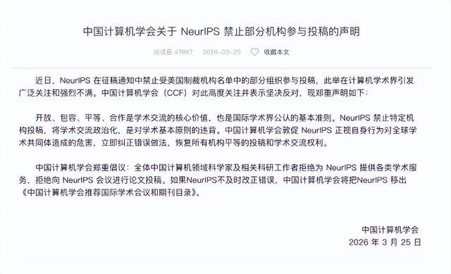 中国这边的反制,就是瞄准其弱点重拳出击。一旦神经信息处理系统大会被移出推荐目录,会发生什么?