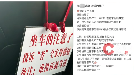 3月26日,一网友发帖称打网约车时,发现司机在车内悬挂带有诅咒性语言的标牌,内容为“坐车的注意了,投诉者全家得癌症配资实盘平台,备注:谁投诉就骂谁”。网友称自己用该打车软件近10年,首次遇到这种明目张胆诅咒乘客的,“像吃了个苍蝇”,因要赶高铁未立刻下车,已拉黑该司机,考虑进行投诉。